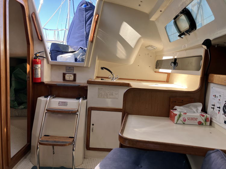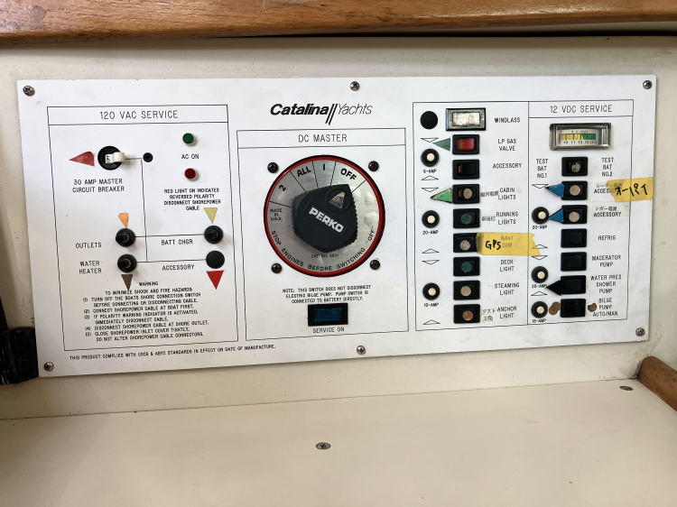 | エレクトリック | 12Vバッテリー X 2(2025年4月交換済)、ソーラーバッテリーチャージャー、 陸電(マリーナに陸電装置が無いので使っていない,一般100Vコンセントへの変換コネクターあり、 但しその先の長いケーブルはありません。) シガーライターソケット(2連) |