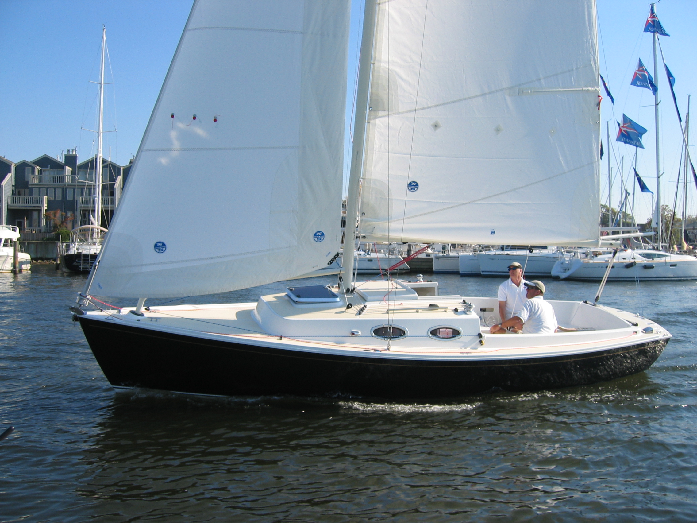 ショーに出品したばかりで、写真は造船所の人 が撮って送ってくれたんですが、これからプロの カメラマンに撮ってもらうそうなので、後でもっと 良いのが来ますが、とりあえずのご紹介です。 全長は25’9”、26フィートのヨットと言っても良 いかもしれません。バラストが何と言っても、約 49%あります。それにこのバルブですから、腰 は相当強いと思います。シングルには良いです ね。さらに、このセルフタッキングジブにジブブ ームです。これは今まで退屈だったダウンウィ ンドの帆走がこれで面白くなります。シングル ハンダーには良い装備です。 このヨットのもうひとつの特徴はエンジンです。 ホンダの船外機を応用して、それにセールドラ イブをつけたものです。ですから、燃料はガソリ ンです。ですから、空気の取り入れと排気には きちんと装備がなされています。 コンパクトなサイズはシングルのデイセーラー には程よいサイズ、気楽な帆走が容易に想像 できますね。詳細はもう少しお待ち下さい。 アメリカではこんなのが大流行!!!!! |