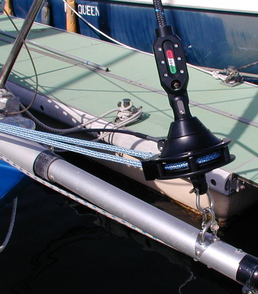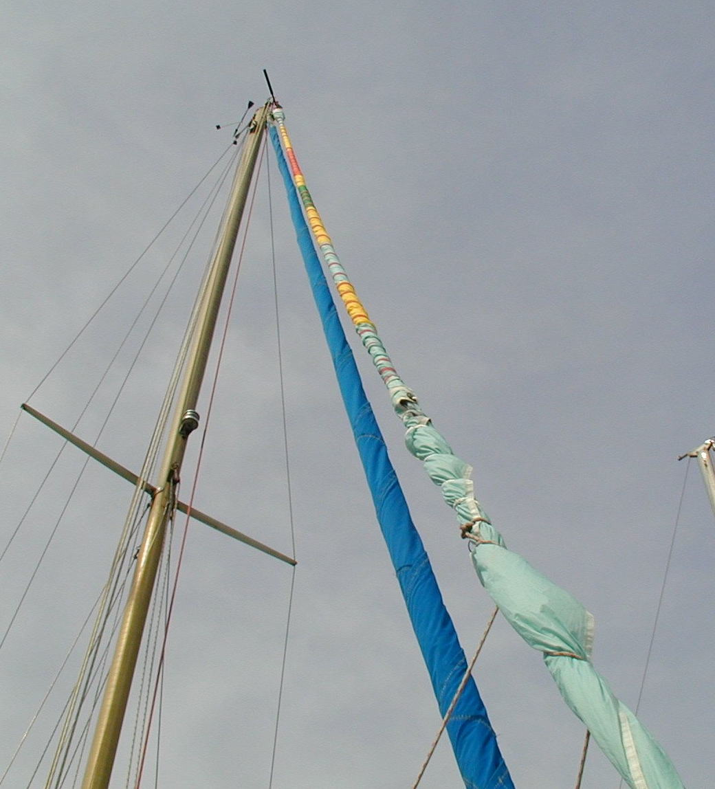 | 先日ご紹介しましたファーリングジェネカーの第一弾を設置しました。オーナーはいつも シングルハンドで、自分でバウスプリットを設置しておられます。いろんな事を試しては それを楽しむという方で、多少邪道だろうが、遊びだもんというセリフで、何でもやってみ るという方です。今回、ジェネカーのファーラーはシングルハンドなので、ダウンウィンドの セーリングをいかに楽にできるかという事で、採用して頂きました。 ちょっと変わっているのは、今回試したのはジェネカーでは無く、スピネーカーです。頭で 考えて、これでもできるはずと思ったわけで、これを試して駄目なら、このスピンをカットし てジェネカーのように改造するし、それでも駄目ならジェネカーを造る。こういう順番で、ま ずスピンを試してみました。スピンが斜めにつくわけですから、効率の良いとは言いがたい のですが、とにかく何でも試す。 結果、うまく行きました。スピンでも、難無く、ちゃんと巻けます。スピンセールのように柔ら かい生地なら、全く問題無く、そのまま使える事がわかりました。ステイになるロープは ぐるぐる巻ける柔らかさを持ちながら、心は硬く、ドラムで回す力が最先端にまで伝わります。 このロープだけでも良いのでしょうが、巻いた時にロープだけでしたら細いので、小さくは巻ける でしょうが、回転を多く巻かないと巻ききれない。それで、このロープの外側には太い柔らかい ホース状のものがあります。これが心となってセールを巻きます。 今度は、ドラム下側にスナップシャックルにして、セッティングをワンタッチにします。マリーナで やるにしても、その方が、へたして海にシャックルを落としたりという事が無いので、楽にできる 確かに、スピンをこんな風に使うのは変でしょう。だけども外からの見た目はそうは分らないです オーナー曰く、みんなスピンが遊んでるよ。レースして、どうこうならこんな使い方は良く無いとは 思うけど、遊びなら充分さ。と言われてました。また、明日も出すから、スピンは巻いたまま、セッ トしたまま。今日は帰られました。スピンでもファーリングにできる。これは面白いですね。 写真ではハリヤードのテンションが少し不足、たるんでますので、もう少しテンションを加えた方が 良いでしょう。残念ながら、今日の試乗では仕事の都合上乗れなかったので、オーナーの単独 試乗になりましたが、オーナーはOKを頂きました。今度、一緒に乗ってレポートしたいと思います |