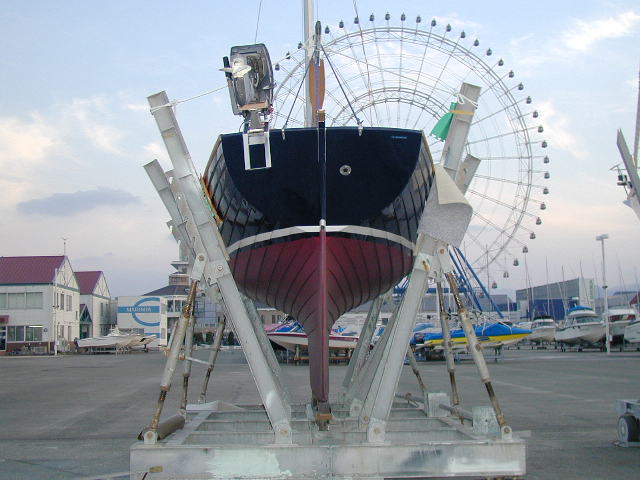 船台がちょっと邪魔してますが、なかなか良 い雰囲気してます。ちょっと夕暮れに撮りま し たので、ちょっと暗いですね。クリンカー形状の ハルが見えません。それにカラーはきれいな ネイビーです。