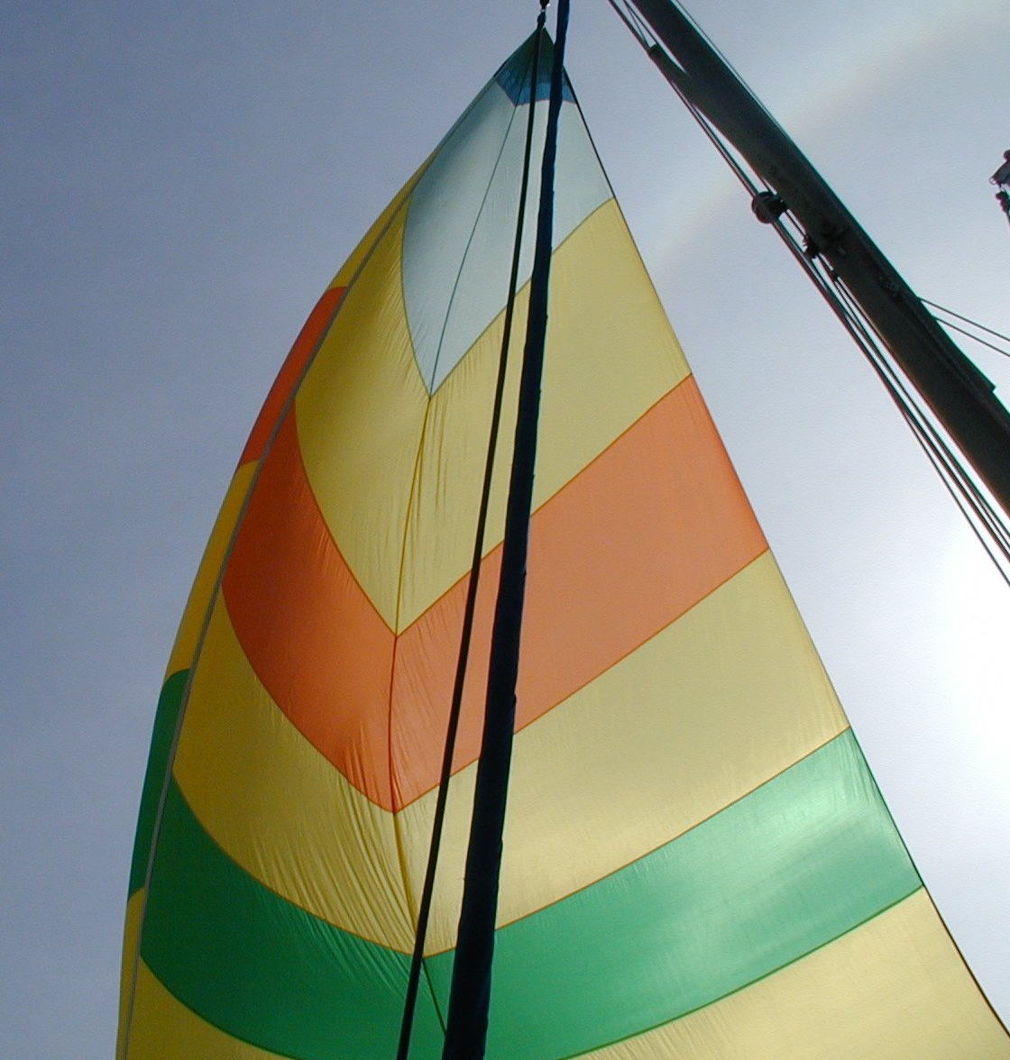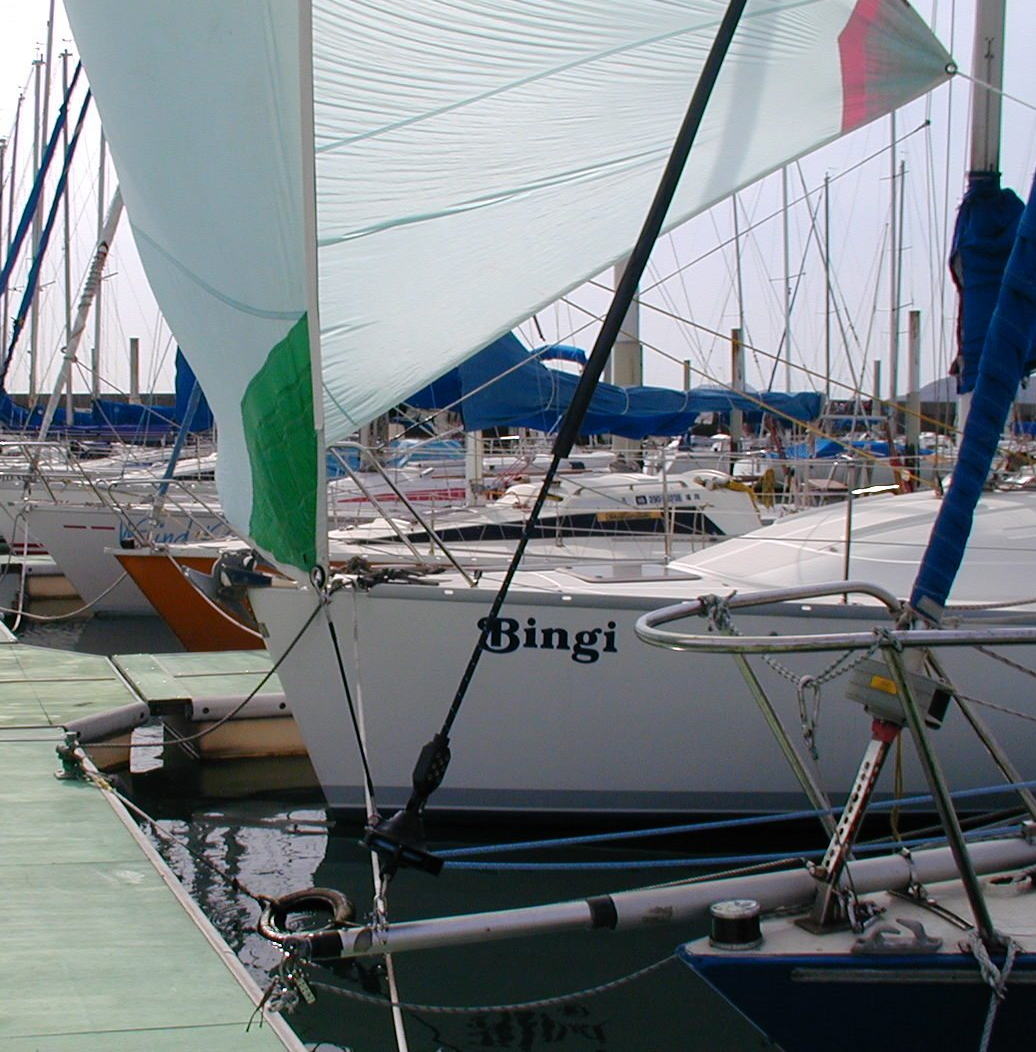 | 先日ご紹介しましたファーリングジェネカーの第一弾を設置しました。オーナーはいつも シングルハンドで、自分でバウスプリットを設置しておられます。いろんな事を試しては それを楽しむという方で、多少邪道だろうが、遊びだもんというセリフで、何でもやってみ るという方です。今回、ジェネカーのファーラーはシングルハンドなので、ダウンウィンドの セーリングをいかに楽にできるかという事で、採用して頂きました。 ちょっと変わっているのは、今回試したのはジェネカーでは無く、スピネーカーです。頭で 考えて、これでもできるはずと思ったわけで、これを試して駄目なら、このスピンをカットし てジェネカーのように改造するし、それでも駄目ならジェネカーを造る。こういう順番で、ま ずスピンを試してみました。スピンが斜めにつくわけですから、効率の良いとは言いがたい のですが、とにかく何でも試す。 結果、うまく行きました。スピンでも、難無く、ちゃんと巻けます。スピンセールのように柔ら かい生地なら、全く問題無く、そのまま使える事がわかりました。ステイになるロープは ぐるぐる巻ける柔らかさを持ちながら、心は硬く、ドラムで回す力が最先端にまで伝わります。 このロープだけでも良いのでしょうが、巻いた時にロープだけでしたら細いので、小さくは巻ける でしょうが、回転を多く巻かないと巻ききれない。それで、このロープの外側には太い柔らかい ホース状のものがあります。これが心となってセールを巻きます。 今度は、ドラム下側にスナップシャックルにして、セッティングをワンタッチにします。マリーナで やるにしても、その方が、へたして海にシャックルを落としたりという事が無いので、楽にできる 確かに、スピンをこんな風に使うのは変でしょう。だけども外からの見た目はそうは分らないです オーナー曰く、みんなスピンが遊んでるよ。レースして、どうこうならこんな使い方は良く無いとは 思うけど、遊びなら充分さ。と言われてました。また、明日も出すから、スピンは巻いたまま、セッ トしたまま。今日は帰られました。スピンでもファーリングにできる。これは面白いですね。 写真ではハリヤードのテンションが少し不足、たるんでますので、もう少しテンションを加えた方が 良いでしょう。残念ながら、今日の試乗では仕事の都合上乗れなかったので、オーナーの単独 試乗になりましたが、オーナーはOKを頂きました。今度、一緒に乗ってレポートしたいと思います |