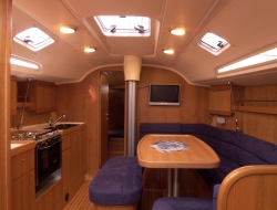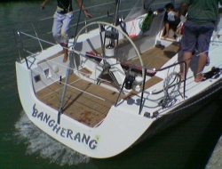 | スポーツヨットとクルージングヨット、何が違うのか?決まった形があるわけでは ありませんが、実際の運用面を考えて、シングルかダブルで充分動かせる必要 はあると思います。それ以上の人数が必要となると、ちょっと稼働率が悪くなる かもしれません。 まずは、セーリングを楽しもう、セーリングしにいこう、ドライブ感を味わおうという オーナーの意識が必要です。それがあれば、何も食料を大量に買い込む事も 無く、コンビ二の弁当とお茶で充分、或いは、短時間ならペットボトル1本の飲み物 があれば充分。まずは、オーナーの気持ちが軽い事が必要です。 行き先は特には決めていない。或いは、近くに島でもあればそれを1周してくる。 風向風速計とスピード計はあった方が良い。いつもそれを見て、風向と風速、それ に対する艇のスピードを見る。クローズぎりぎりで走る。これ以上上ると裏風が入る それのぎりぎりで走る。その時のセールのトリミングをどうするか。 ジェノアカーの位置はとりあえず、フットとリーチの両方に均等にテンションがかかる 位置、それで目一杯引き込む。リーチ部がスプレッダーに接触する。メインシートも トラベラーのカーは中央で、目一杯シートを引きこむ。これでヨットはどんな風に走 るだろうか。その時の風速は何ノット?艇速は何ノット?ヒールは何度ぐらいヒール しているだろうか?これが基準となる。 もし、ヒールが大きく、サイドデッキが海水で洗われるようなら、ヒールしすぎ。ヒール しすぎると、ヨットは風上に上ろうとするから、真っ直ぐ走るには舵で風下の方にきら ないと真っ直ぐ走らない。それで舵は抵抗になっているので宜しくない事になる。 まあ、20度ぐらいのヒール角度なら良いんじゃないでしょうか。そこでちょっと風を抜く でも上り角度はキープしたいなら、反対舷のジブカーを少し後ろにずらしてやる。 それでタックすると、新しいタックではジブカーが後部にずれている為、セールのクリュ ーに対するシートの引き込み角度が変わっている。よろ後ろから引くという事はセール のフット側によりテンションが大きくかかり、リーチ側は少し緩む事になる。するとリーチ は少し開く、開いた所から風が抜ける。でも、セールの下部はタイトサイドステーにぴっ たりくっつく。上部で風を抜き、下部で角度を稼いでいる。 メインセールも同じ事。シートを緩めれば、角度が開く、それで、トラベラーのカーを風上 側に引き上げる。シートが緩むという事はリーチのテンションが緩む、でも、トラベラー カーを引き上げる事によって、セールは再び内側に入ってくる。 加速をするなら、少し進行方向を落として、セールを少し緩めて加速、そして再び上る。 とにかく、スポーツセーリングはセーリングに意識を置いて、より良い走りを目指す。 しかしながら、レーサーではありませんので、キャビンも充実して、ちょっとロングに出る 場合でもヨットにゆったり寝泊りできる装備を備えている。 コマー社ではクルージング艇もセーリング性能を考慮してスポーツとしての考え方を持っ ています。そして、さらにオープントランサムはさらに、そのスポーツカー的デザイン。 これを家族で乗るんです。従来ならレーサーかと思わせるような外観デザインも、少し その様相を呈したスポーツヨット。さすがはイタリアです。 ![]() これファミリースポーツヨットなんです。そして内装はこれ COMET41S |