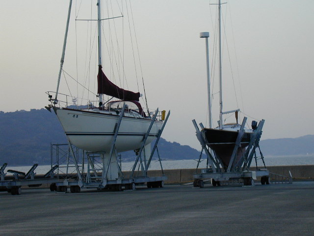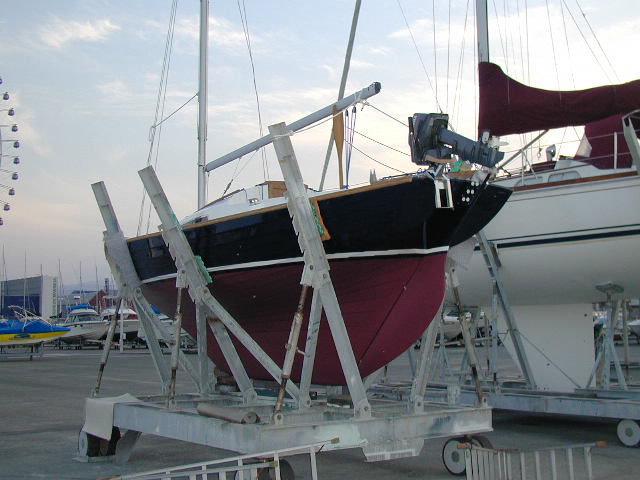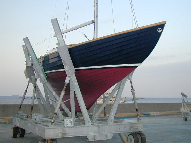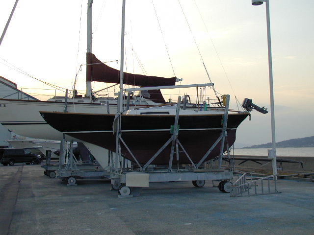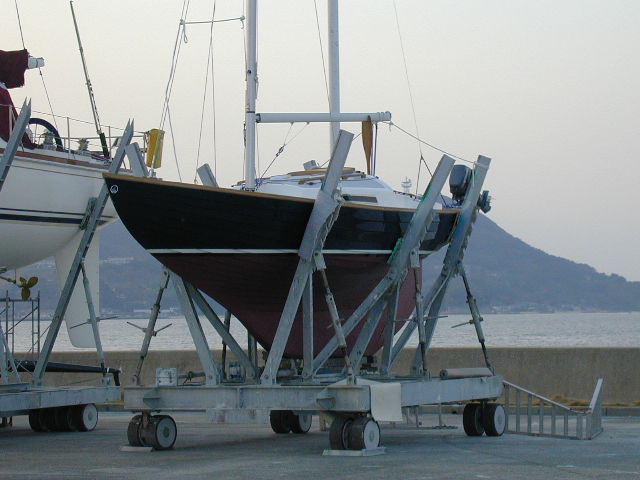 船台がちょっと邪魔してますが、なかなか良 い雰囲気してます。ちょっと夕暮れに撮りま し たので、ちょっと暗いですね。クリンカー形状の ハルが見えません。それにカラーはきれいな ネイビーです。